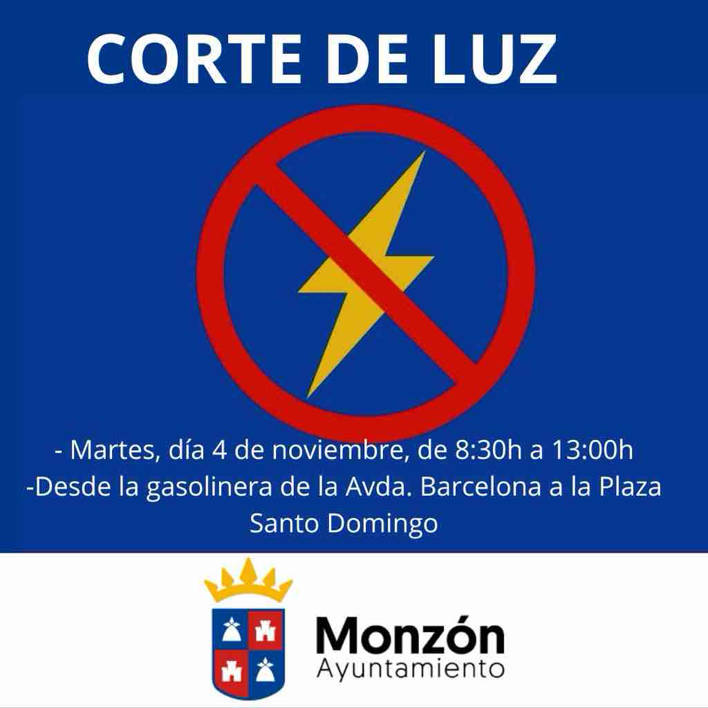 💡Endesa informa que el martes, día 4 de noviembre, de 8:30h a 13:00h -Desde la gasolinera de la Avda. Barcelona a la Plaza Santo Domingo habrá un corte de luz. ℹ️Avda. Barcelona. -Avda. Lérida, C/ La Balsa, C/Binaced, C/ Bovila, C/ Campo de Tiro, C/ Alfarería, C/ Angosta, C/ Balsa, C/ La Huerta, C/ Ozcoidi, C/ Salou, C/ Santo Domingo Sabio, C/ Transversal, CN/ Salobrás, CR/ Binaced, Cerro Santa Quiteria, C/Cabañera, C/ Castillo, C/ Cubierta,C/ Nueva, C/ Ozcoidi, C/ Penosa, C/ Romeral, C/ Santo Domingo Sabio, C/Transcolegial, C/ Trinidad, PZ/ Santa María y PZ/Santo Domingo.