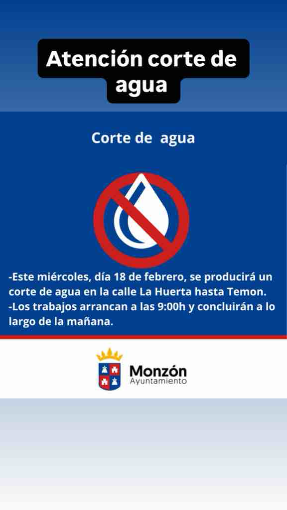 Corte de agua en la calle La Huerta hasta la empresa Temon este miércoles, día 18 de febrero, desde las 9:00h hasta concluir esa misma mañana.
